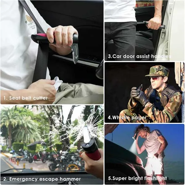 Ručka za podršku, razbijač stakla, rezač sigurnosnog pojasa, punjiva LED svjetiljka i zviždaljka za pomoć.